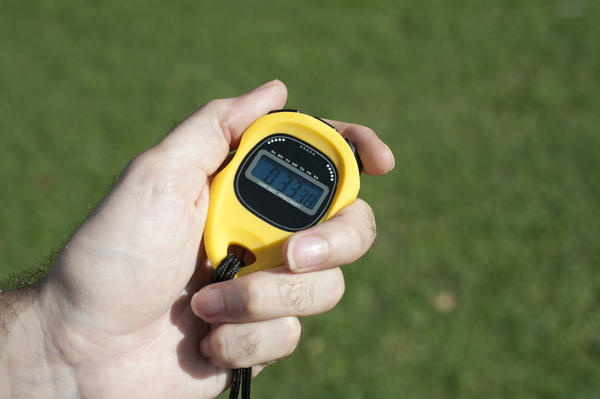 clock, competition, copyspace, duration, equipment, grass, hand, holding, man, speed, sport, stopwatch, timer, timing, training, counting, 33 seconds, yellow, green, sports field
