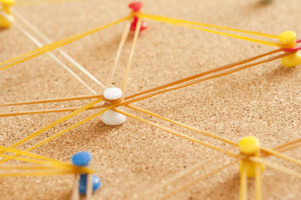 board, collaboration, connection, contacts, cooperation, cork, hub, interconnected, network, pins, rubber bands, social network, team, thumb tacks, plastic, macro