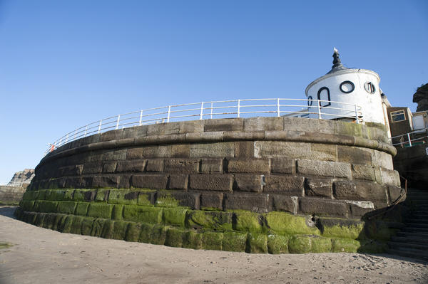 protection, construction, stone, architecture, beach, sand, coastal, resort, town, nautical, marine, england, low, tide, defense, yorkshire, seawall, whitby, curving, sea wall License: