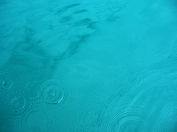 circular ripples from drops of water landing of the surface of bright cyan coloured water