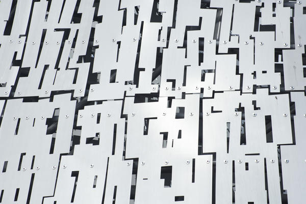 Close up detail of the structure of the Kelpies horse statue at Falkirk, Scotland showing the pattern of the offset irregular metal plates built to commemorate their role in industry