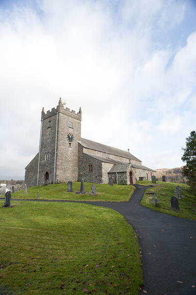 Scenic view of St Michael and All Angels Church, the historic stone church in the picturesque village of Hawkshead in the Lake District , on the skyline under a cloudy sky