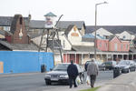 People walking along the street past the boarded up Frontierland Themepark on the Morecambe promenade which is slowly being dismantled and removed