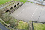 high angle view of an empty carpark with brick pavers