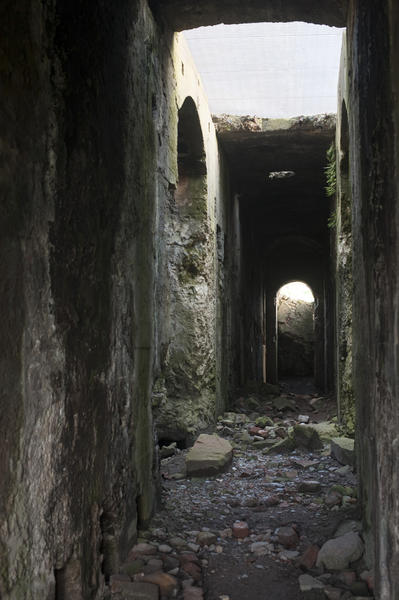 View down a narrow roofless passageway in a ruined mine building in the Levant Mine near Pendeen in Cornwall