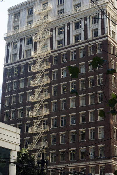 metal external fire escape stairs on the side of a tall building