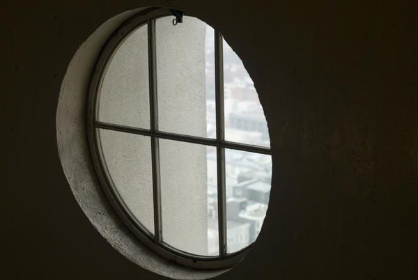 looking out, coit tower, window, city beyond, cityscape, view, round, glass, circular, frame, light, inside, interior License: