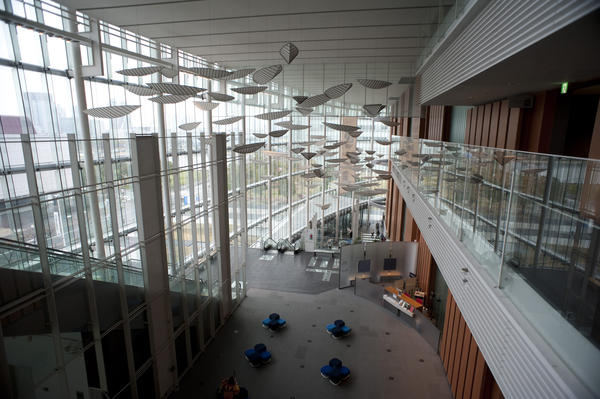 bright, modern, building, science, construction, architecture, design, structure, hall, space, interior, museum, balcony, internal, airy, tokyo, glass-walled, multistory, emerging science musem, double-volume