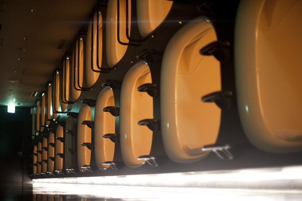 rows of sleeping 'pods' in a capsule hotel