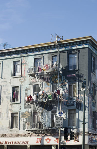 city, san francisco, laundry, hanging from balconies, balcony, dry, air, ugly, chinese laundry, washouse, building