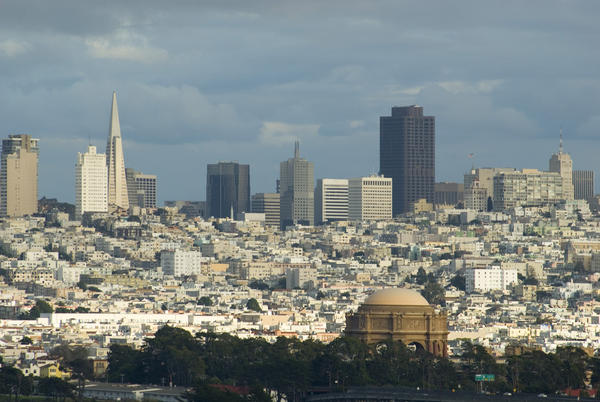 telephoto view of san francisco with the Palace of Fine Arts in the foreground
