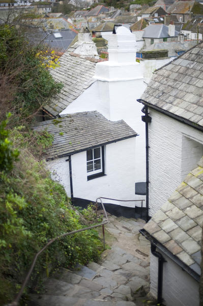 Meandering stone steps in the quaint fishing village of Polperro in Cornwall with its traditional white-washed fishermans cottages