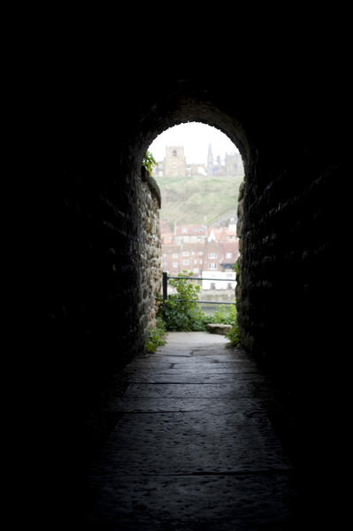 View along a dark stone passage through an open archway of St Marys Church and Abbey ruins at Whitby in Yorkshire