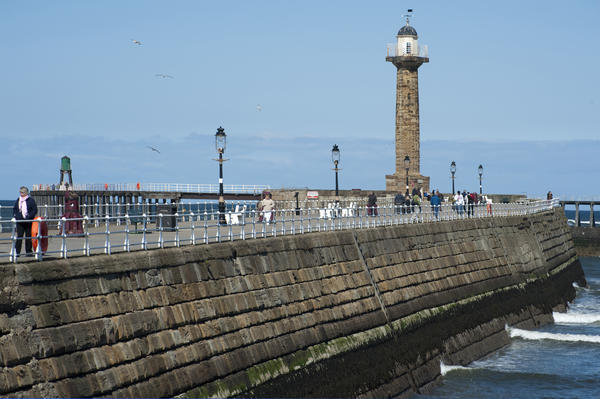 vacation, people, blue, summer, sky, scenery, ocean, sea, water, pier, harbor, scenic, seaside, seashore, resort, warning, lighthouse, west, beacon, maritime, england, port, english, whitby, north yorkshire