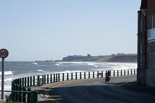 The Whitby town and sea seen in the horizon from the Sandsend village coastal road. Sandsend, Whitby, North Yorkshire, England, United Kingdom, Europe