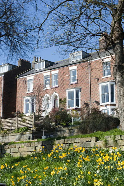 Low angle view across flowering spring daffodils of a row of upmarket terraced brick townhouses with bay windows