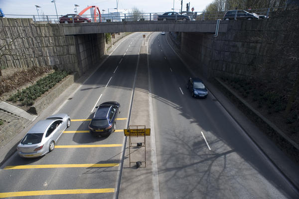 Traffic and cars on a dual carriageway underpass in Newport , Wales with traffic also visible on the bridge above