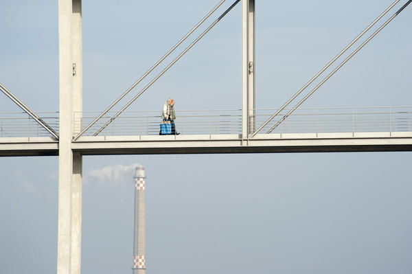 person, walking, structure, high, skyline, steel, bridge, pedestrian, overhead, footbridge, architecture, access, infrastructure, crossing, construction, span, overcrossing, walkway, urban, design