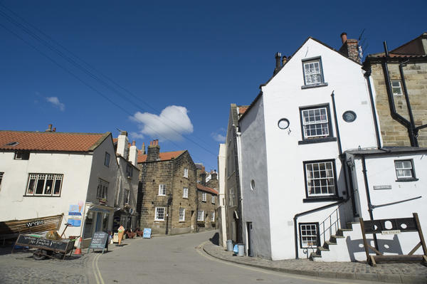 Street scene in the quaint Yorkshire fishing village of Robin Hoods Bay with its traditional stone and whitewashed buildings