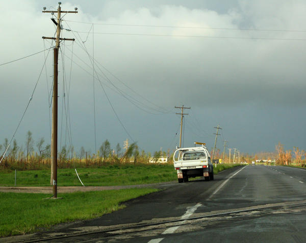 tropical cyclone, cyclone yasi, storm damage, lines, electric, power cut, broken, electric supply, powerless, without power, powerline, electricity, snapped, broken, lines down
