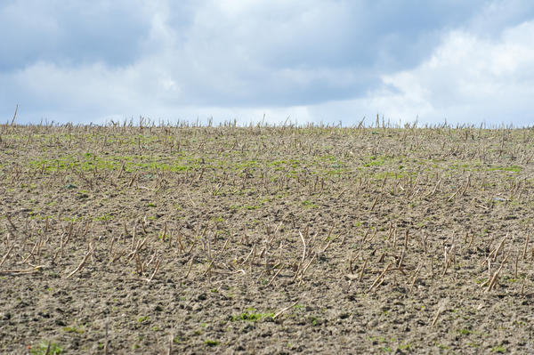 Ploughed agricultural field with small remnants of crop stubble