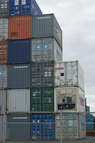 A stack of metal shipping containers standing on the dock waiting to be loaded on to a container transport ship.
