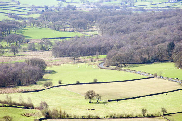 Scenic view over open countryside with green agricultural pastures and dense woodland
