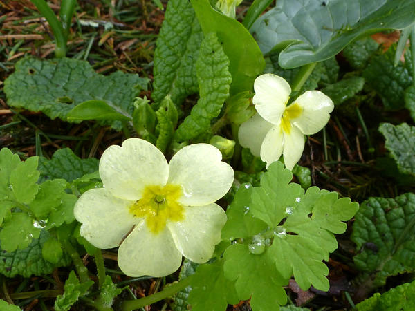 easter, flower, outdoors, plant, season, spring, wild, woodland, dainty, dewdrops, primrose, raindrops, yellow, green, leaves