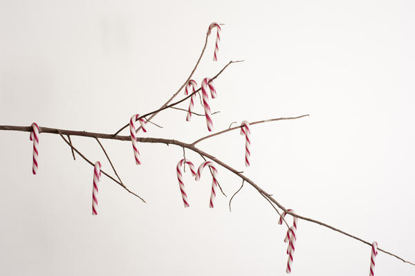 bare, branch, candy, canes, christmas, decorations, minimalist, peppermint, sweets, xmas, kids, treats, hanging, copy-space, greeting, white, red