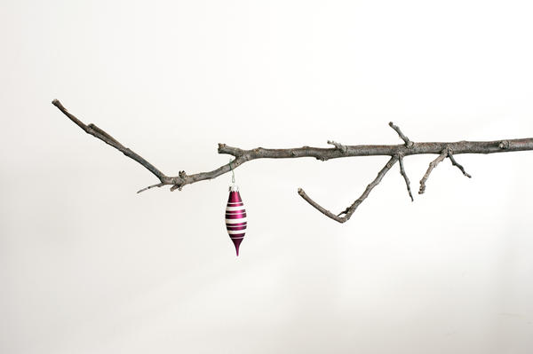 Poor Christmas for a hard up family with a single lone bauble decoration hanging on a bare tree branch over a white background with copy space