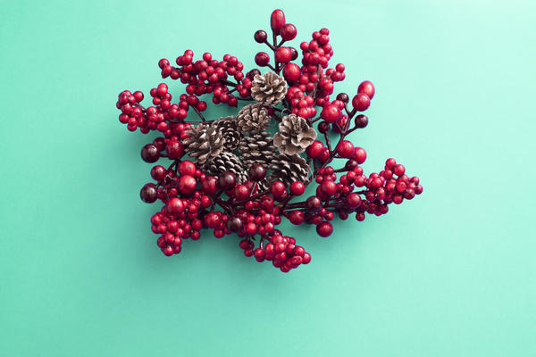 christmas, decoration, holiday, xmas, greeting, celebration, background, green, berries, red, wreath, cones, pine, copy space, frosted