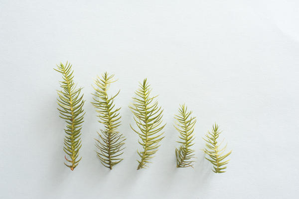 Row of green pine twigs arranged in descending height order over a white background with copyspace