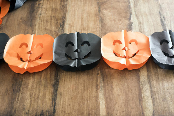 Halloween party decoration paper chain of smiling Jack-o-lantern pumpkin faces in orange and black on a wood background