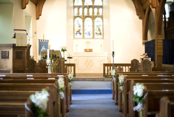 a view down the church aisle towards the altar and stained glass windows at the top of the church