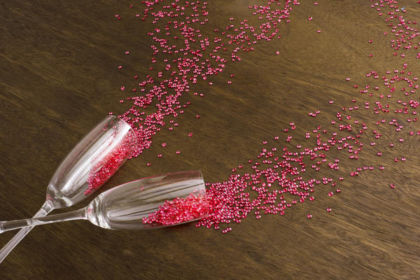 champagne, flutes, glasses, glitter, red, scattered, spilling, celebration, decoration, drinks, festive, party, event, copy space, new year License: