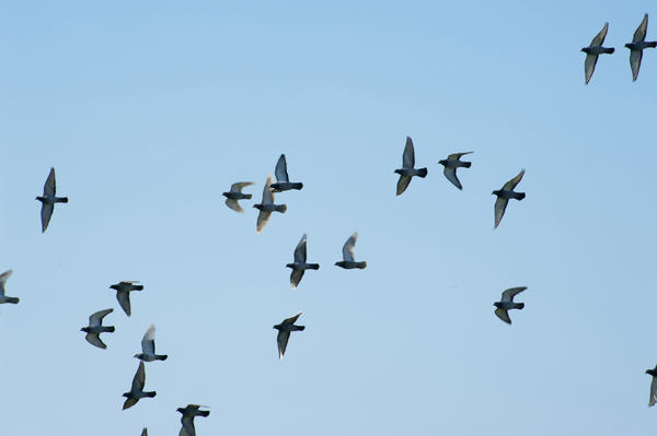 group, direction, blue, travel, sky, background, silhouette, scenic, high, avian, togetherness, animals, flight, wings, flying, birds, spread, winged, same, silhouetted, midair, migration, migrating, underside, flocking License:
