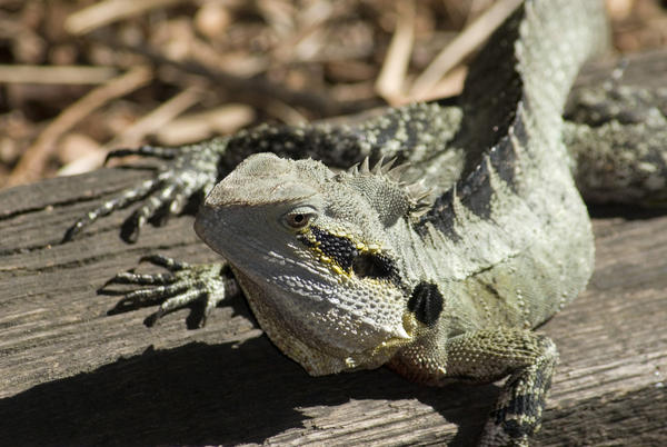 Close-up of the head and spines of a green iguana sunning itself on wood