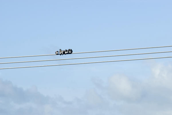 Small Flock of Pigeons Huddled Together and Resting on power lines Against Blue Sky