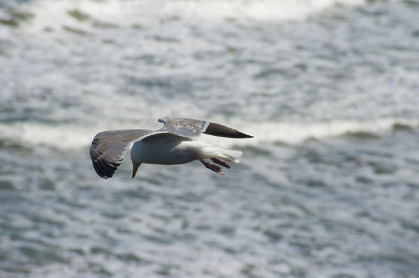 Wonnderful shot of a flying seagul in focus over a motion blurred background