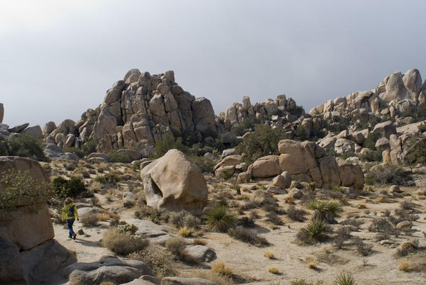 joshua tree, park, walker, hiker, walking, figure, contre jour, wet, jagged, rocky, national park, landscape, nature, outdoor, sandstone, dessert, arid, cactus License: