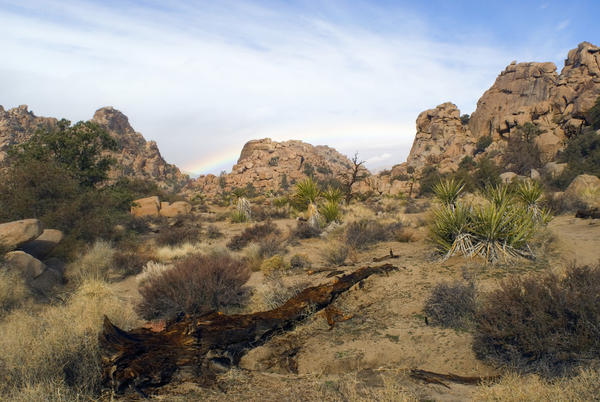 joshua tree, park, national park, rainbow, fallen tree, grass, sandy, dry landscape, nature, outdoor, sandstone, dessert, arid, cactus License: