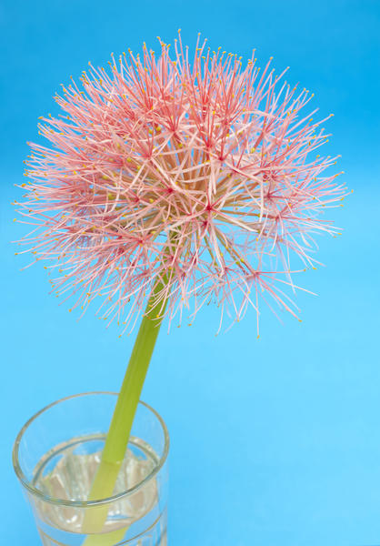 Pink Scadoxus Flower with Bright Green Stem in Glass of Water on Light Blue Background