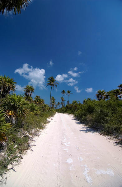 mexico, sand, track, dirt track, sandy, jungle, plants, palm, trees, blue sky, hot, dry License: