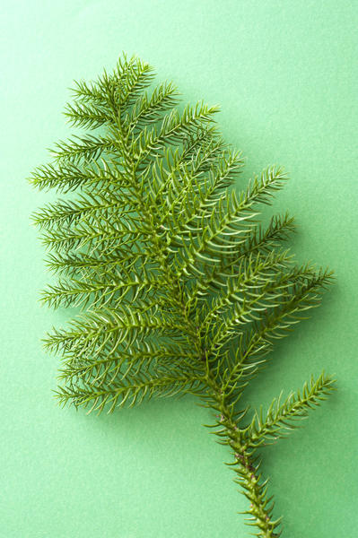 A green fern like pine tree frond with sharp leaves isolated on a plain green background.
