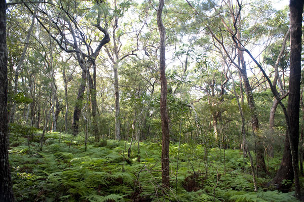 Scenic landscape view of open woodland with lush green undergrowth between the trees