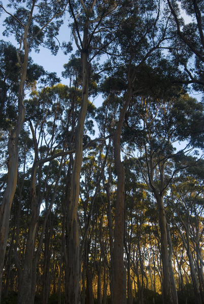 A grove of tall gum trees in a forest with side light
