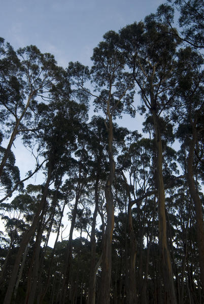 a grove on tall gum trees against a twilight sky