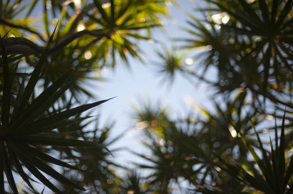green, plant, background, leaves, foliage, tropical, exotic, palm, crown, spiky, frond, shallow dof, environment, botanical, blue, sky, vacation, travel, tropics, concept