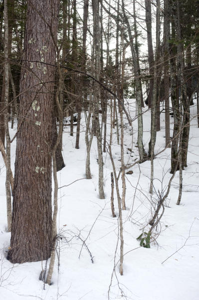 Winter woodland with a fresh fall of pristine white snow covering the ground between the tree trunks