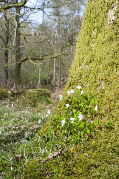 Pretty dainty little white wood anemones growing at the foot of a moss covered tree trunk with a woodland background